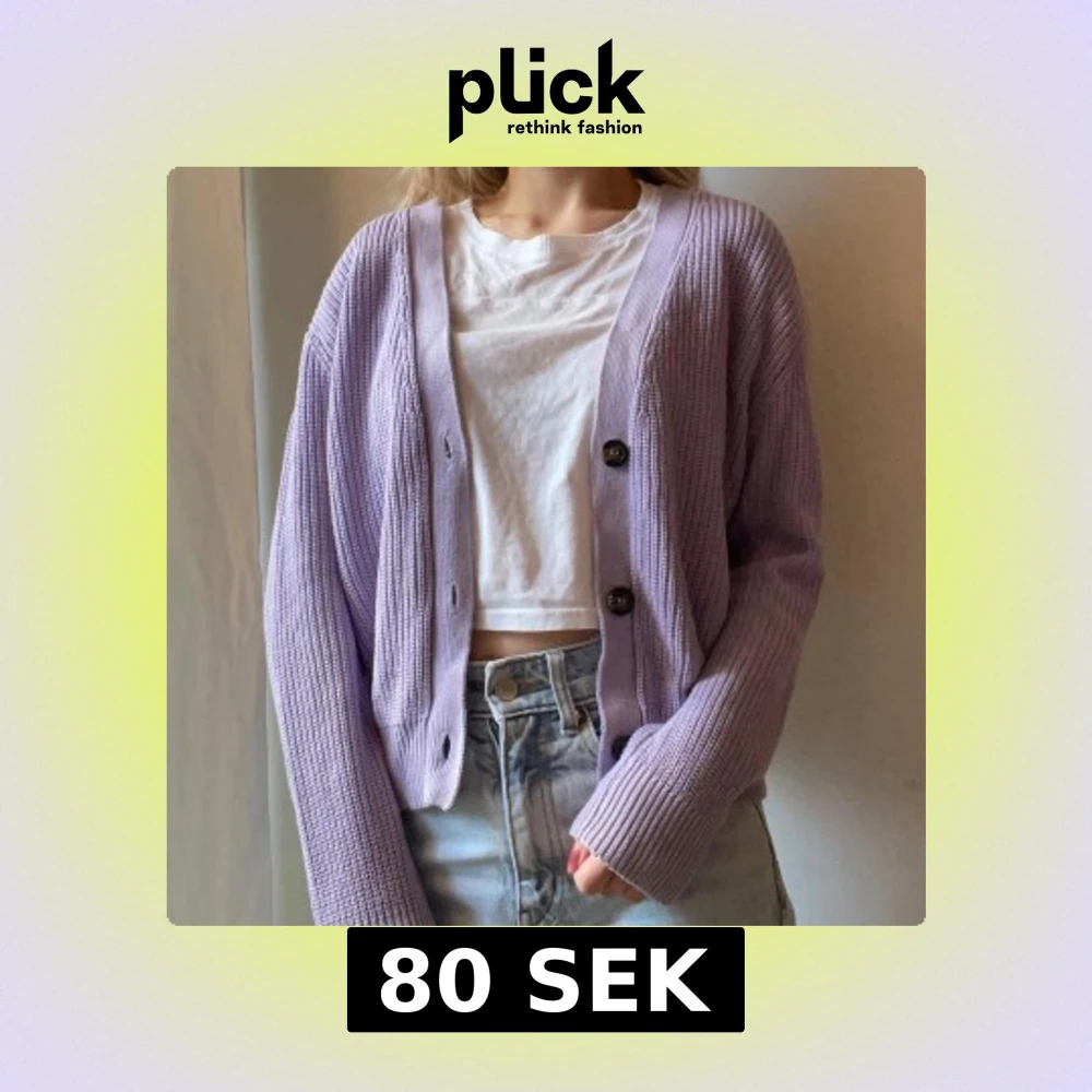 Mysig lila stickad kofta med v-ringad design med knappar framtill och långa ärmar.