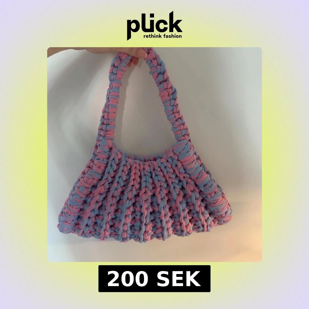 Superfin handgjord axelväska med chunky virkat mönster i pastellrosa och ljusblått. Väskan har en bred axelrem och är gjord i mjukt material som ger en cool och unik look. Perfekt för dig som vill sticka ut med accessoarer!