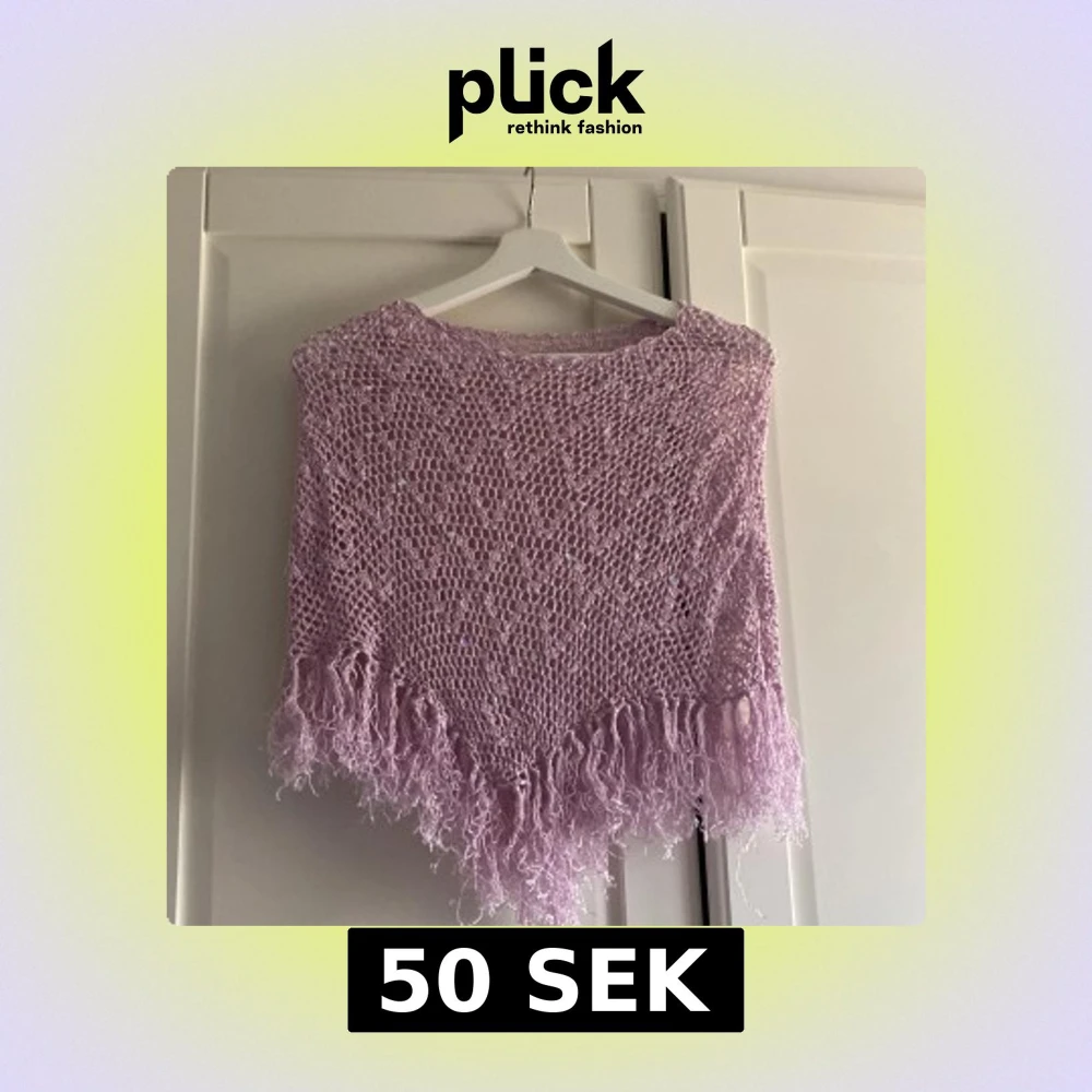 Säljer en ljuslila virkad poncho med glittrande paljetter och fransar längs nederkanten.