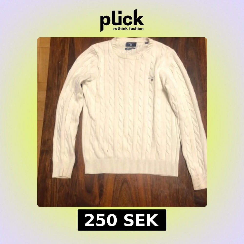 Säljer en stilren vit kabelstickad tröja från GANT i premium bomull. Tröjan har en klassisk rund hals och GANT-loggan broderad på bröstet. Perfekt för en elegant och avslappnad look.