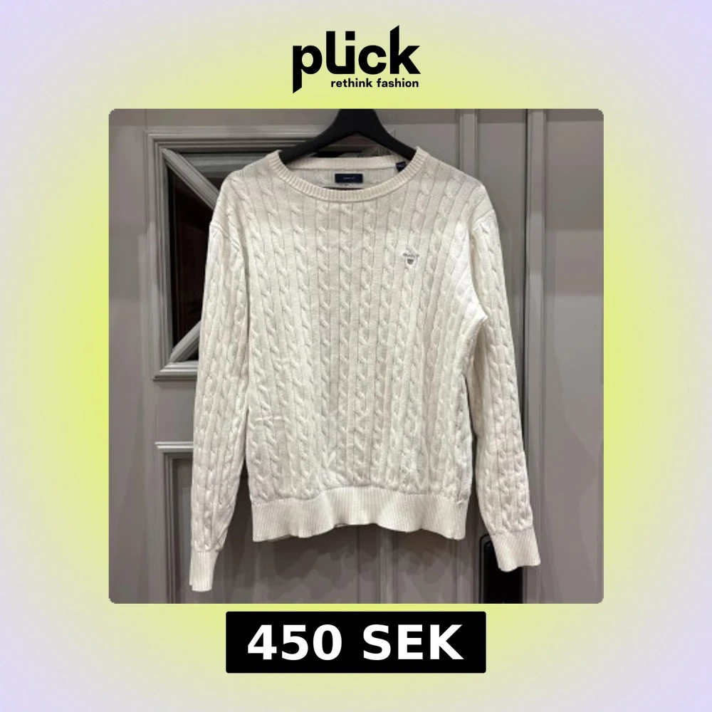 Säljer en stilren vit kabelstickad tröja från Gant med rund halsringning och ett diskret broderat emblem på bröstet. Perfekt för kyligare dagar och ger en klassisk look.