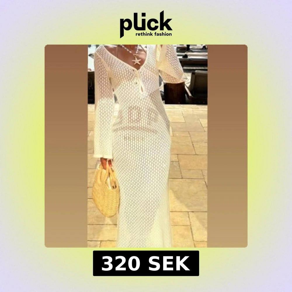 Superfin långklänning i vit stickad design med djup v-ringning och knyt framtill. Klänningen har långa ärmar och ett genombrutet mönster som ger en luftig känsla, perfekt för sommardagar. Snygg passform som framhäver siluetten.