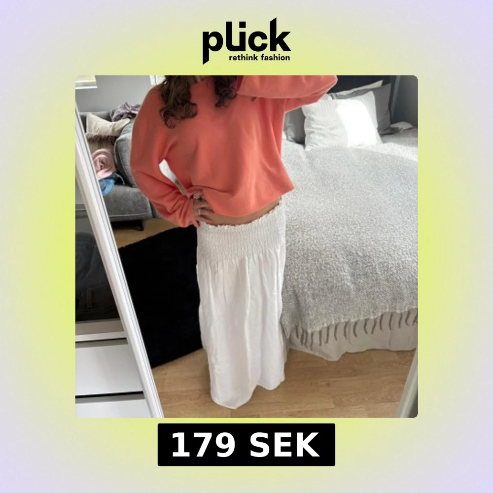 Säljer en vit långkjol med ribbad midja som ger en snygg och bekväm passform. Kjolen är luftig och enkel att styla med både crop tops och stickade tröjor.🌷🤍