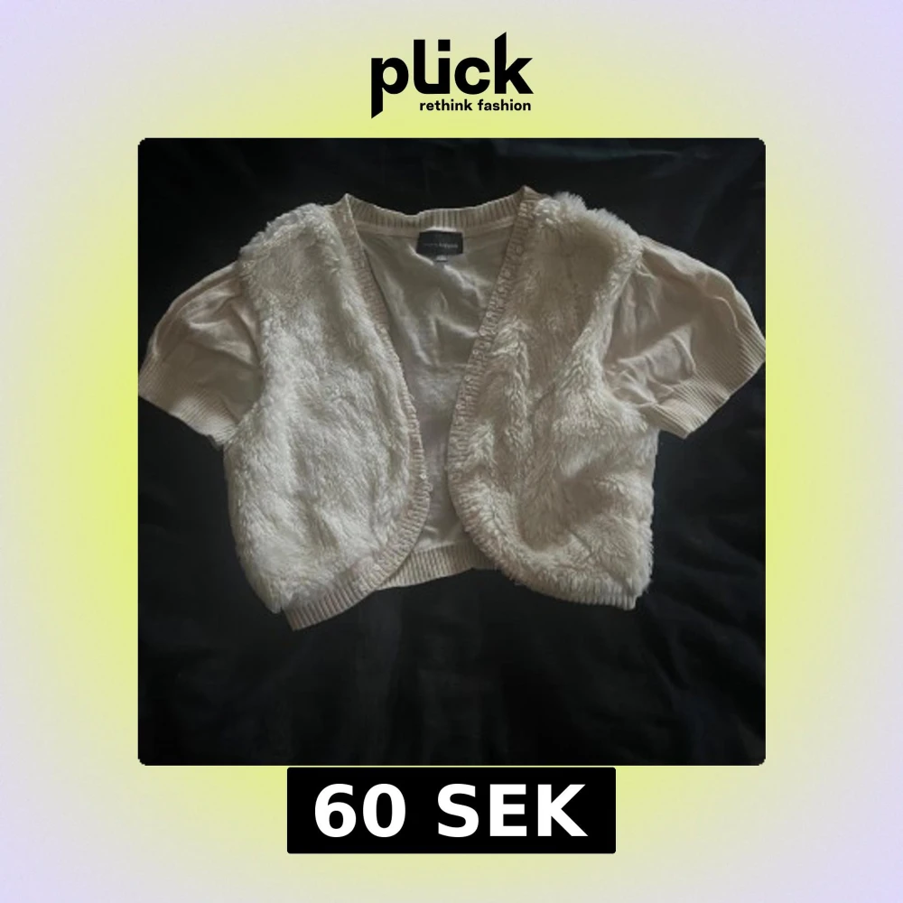 Säljer en söt vit pälsväst från KappAhl med korta ärmar. Västen har ett fluffigt pälsmaterial framtill och stickade detaljer längs kanterna. Säljs för 40kr+frakt