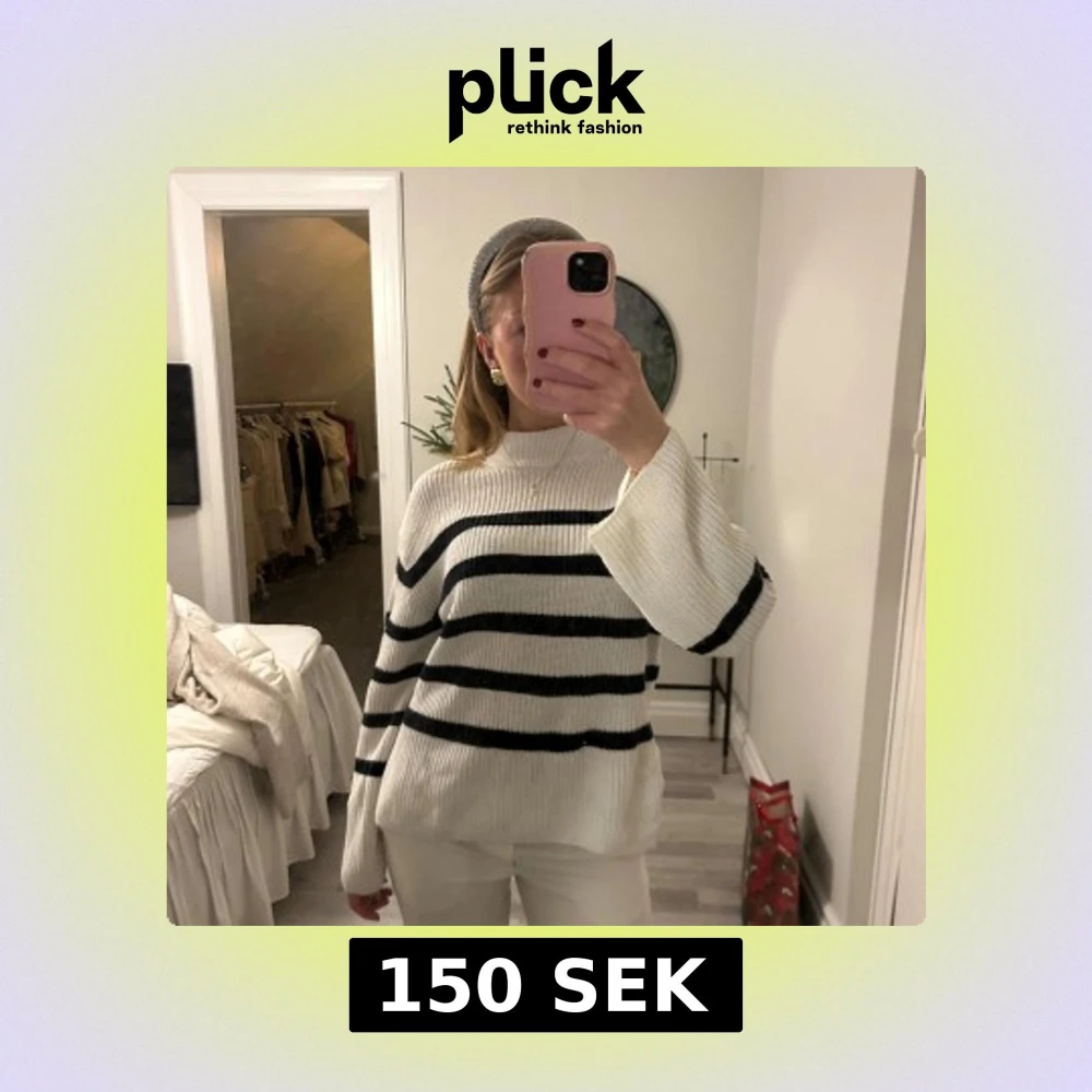 Säljer en snygg vit stickad tröja med svarta ränder. Tröjan har långa ärmar och en bekväm passform. Perfekt för en stilren look.