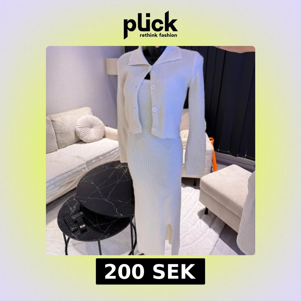 Superfin vit ribbad långklänning i stickat material med smala axelband och en liten slits framtill. Tillhörande kort kofta med stora knappar och krage ingår. Perfekt för dig som gillar en clean och stilren look. Passar perfekt som oversize modell.
