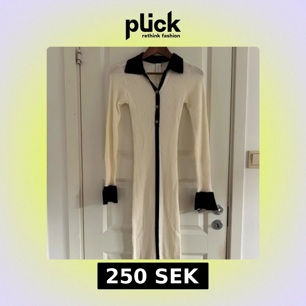 Supersnygg ribbad långklänning från YAS i vit med svarta detaljer på krage, knappslå och ärmslut. Klänningen har lång ärm, v-ringning och knappar framtill. Materialet är mjuk stickad bomull som sitter slim och markerar figuren.