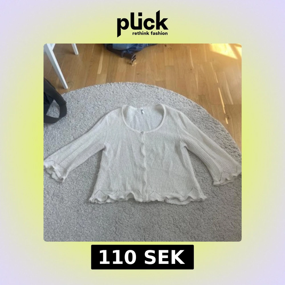 Så söt, använd fåtal gånger🫶 strl L men liten i storleken så passar mig perfekt som brukar ha S-M. Trekvartsärmad kofta!
