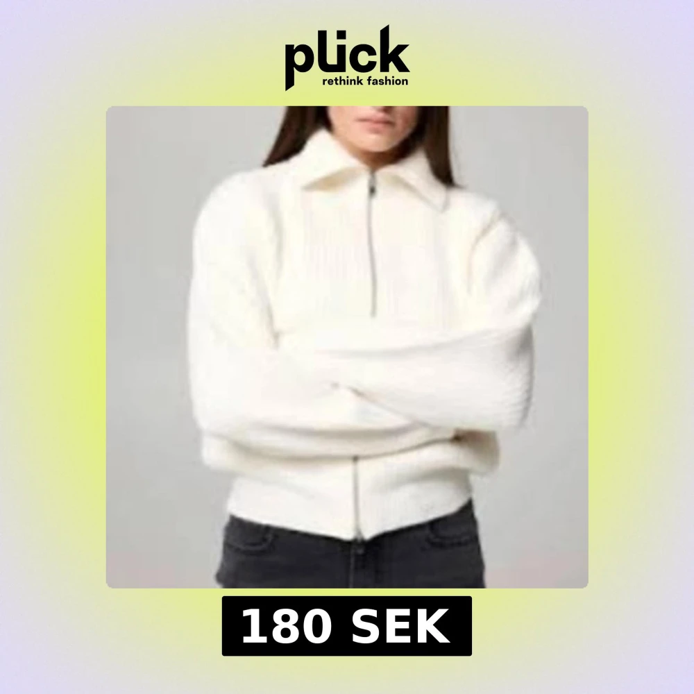 Mysig vit stickad kofta med dragkedja framtill. Perfekt för kyliga dagar när du vill ha något bekvämt och stilrent. Den har långa ärmar och en avslappnad passform som gör den lätt att matcha med olika outfits. Storlek s bikbok