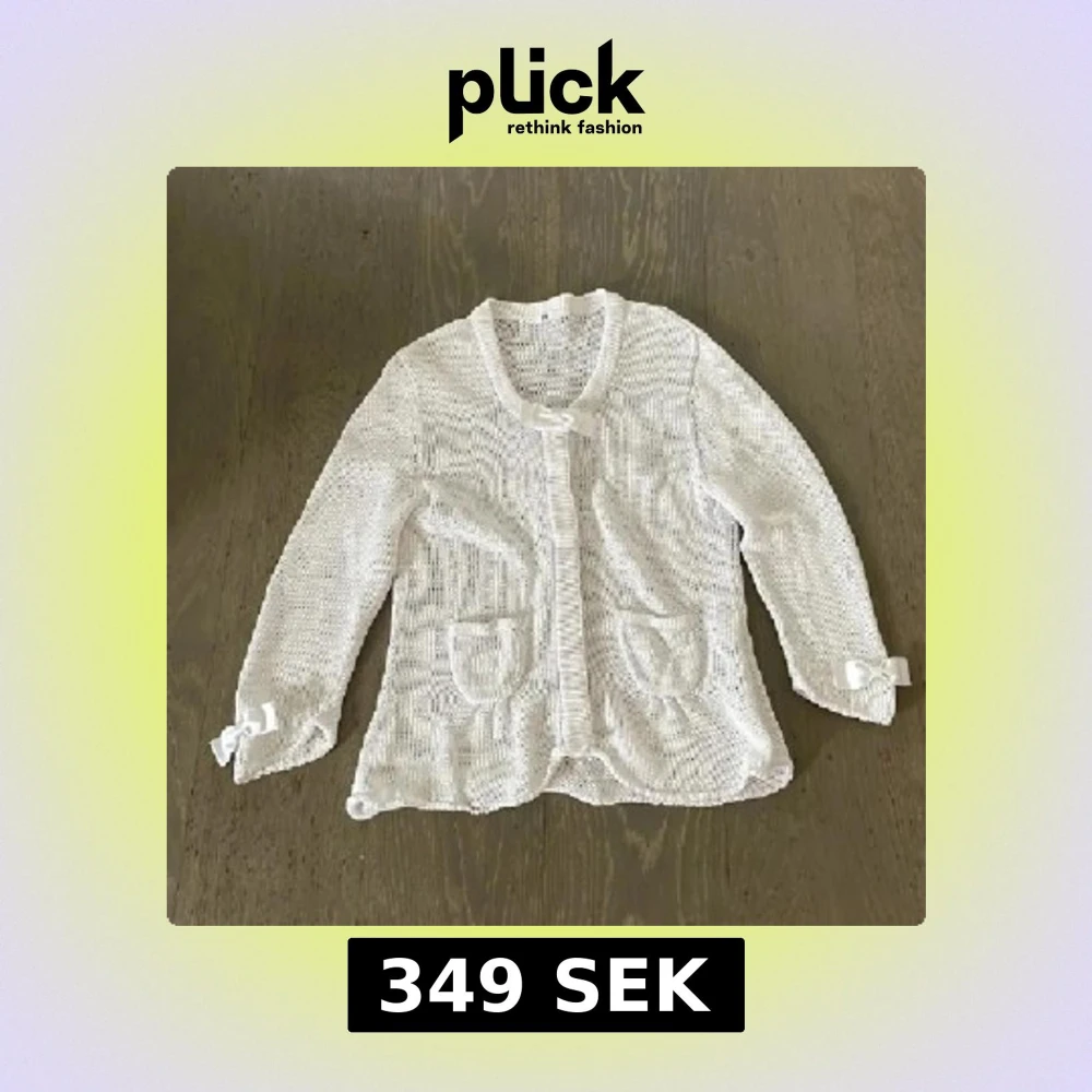 Supersöt vit stickad kofta med långa ärmar och två fickor framtill. Koftan har fina rosettdetaljer vid halsen och vid ärmsluten som ger en gullig touch. Perfekt att slänga över en topp när det är lite kyligt ute. Obs dåliga bilder blev det men den är i nyskick utan fläckar eller nått❤️