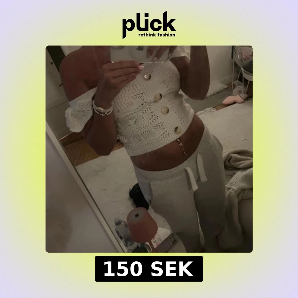 Supersöt vit stickad topp med offshoulder och stora dekorativa knappar framtill. Toppen har virkade detaljer och volang vid ärmarna, vilket ger en romantisk vibe. Perfekt för dig som gillar en feminin och trendig stil.
