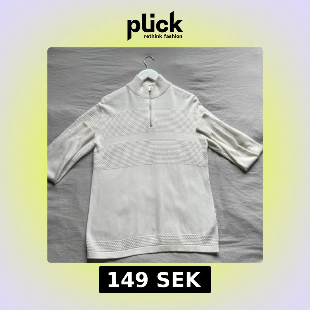 Snygg vit stickad polotröja med halv dragkedja framtill och strukturstickade detaljer på bröstet, ärmarna och nederkanten. Tröjan var en ribbad krage som ger en clean och modern look. Perfekt för dig som gillar stilrena plagg.