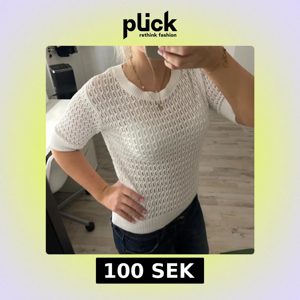 Säljer en vit stickad topp från lager 157 med korta ärmar och rund hals. Tröjan har ett snyggt hålmönster och ribbade muddar vid ärmslut och nederkant. Perfekt för vår och sommar när du vill ha något luftigt men ändå stilrent.