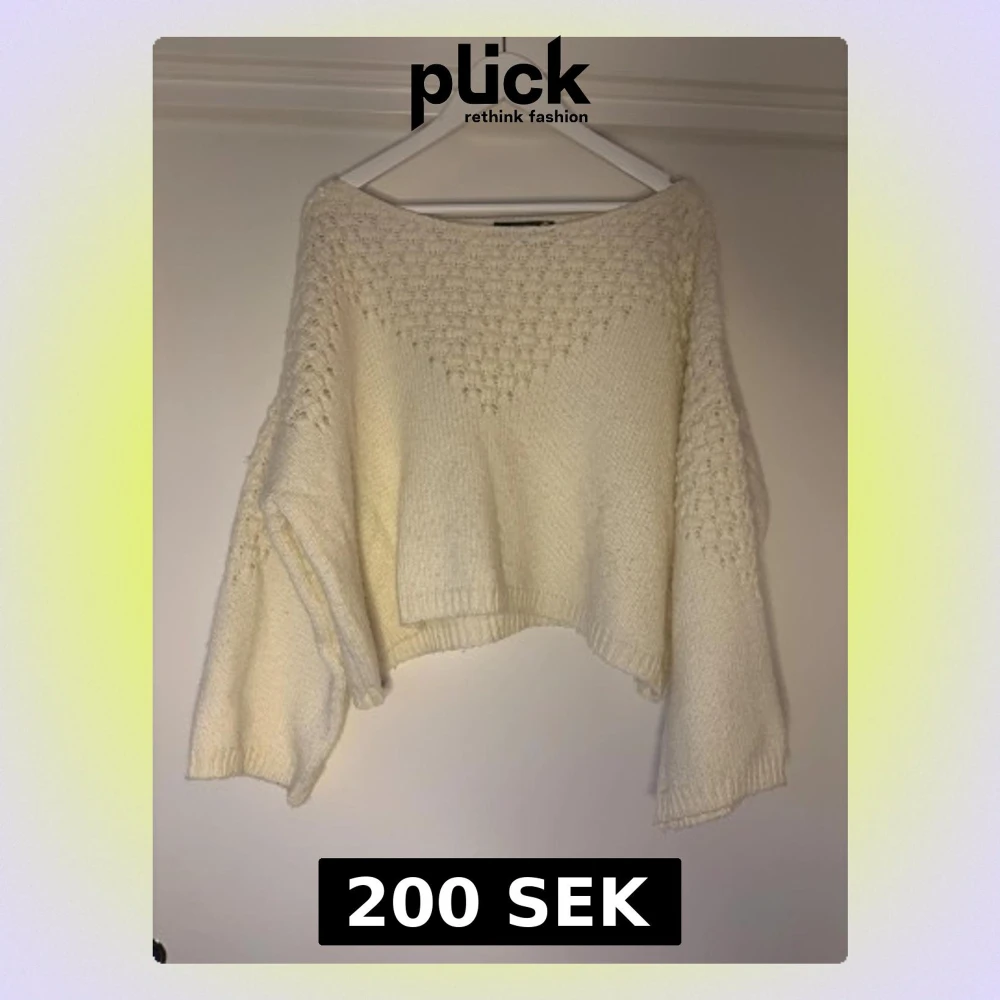 Supermysig vit stickad tröja från BikBok i ullblandning. Tröjan har ett snyggt strukturmönster upptill och på ärmarna, samt en lite lös och boxig passform med långa ärmar. Perfekt för kyliga dagar och enkel att styla till jeans eller kjol.