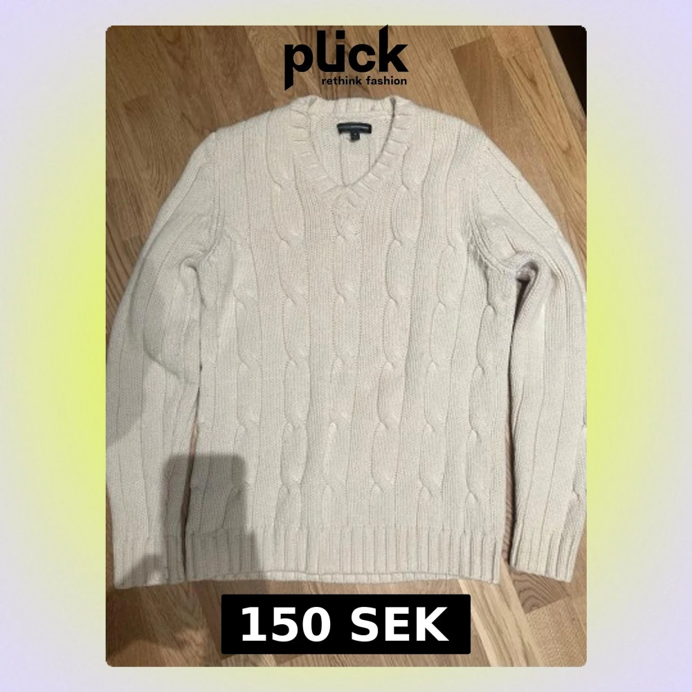 Säljer en vit kabelstickad tröja från Express Design Studio i storlek M. Tröjan har v-ringad hals, långärmad design och grovstickat mönster med breda ribbade muddar vid ärmslut och nederkant. Perfekt för kyliga dagar och enkel att matcha med jeans.