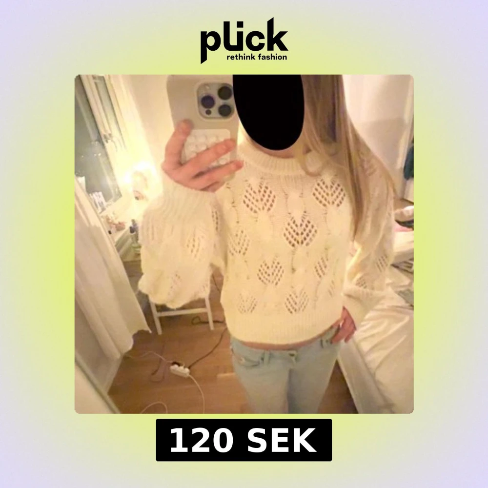 Säljer en vit stickad tröja från Lindex i storlek S. Tröjan har ett snyggt hålmönster, ribbad hals och muddar samt långärmad modell. Den är lite croppad och har en mjuk, cozy vibe som passar perfekt till jeans eller kjol.