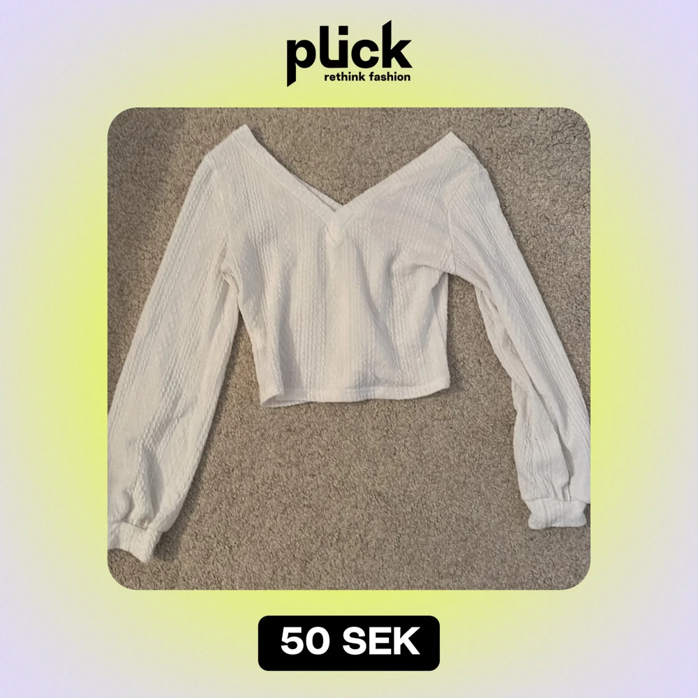 Säljer en stilren vit blus med v-ringning och långa ärmar. Blusen har en lätt textur och är perfekt för både vardag och fest. Den är croppad och ger en modern look. Passar bra till jeans eller kjol🍂🧡