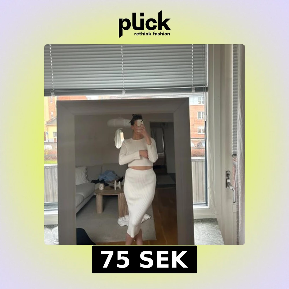 Säljer ett vitt ribbad set från Nova of Sweden. Långärmad croppad överdel och en figurnära kjol med hög midja. Materialet är stickat och mjukt, perfekt för dig som gillar minimalistisk stil och vill ha något som känns både chill och trendigt. En söm i kjolens midja har dock lossnat, se bild. Lite kort i ärmarna. Setet har storlek onesize men passar mig som är en M/L.