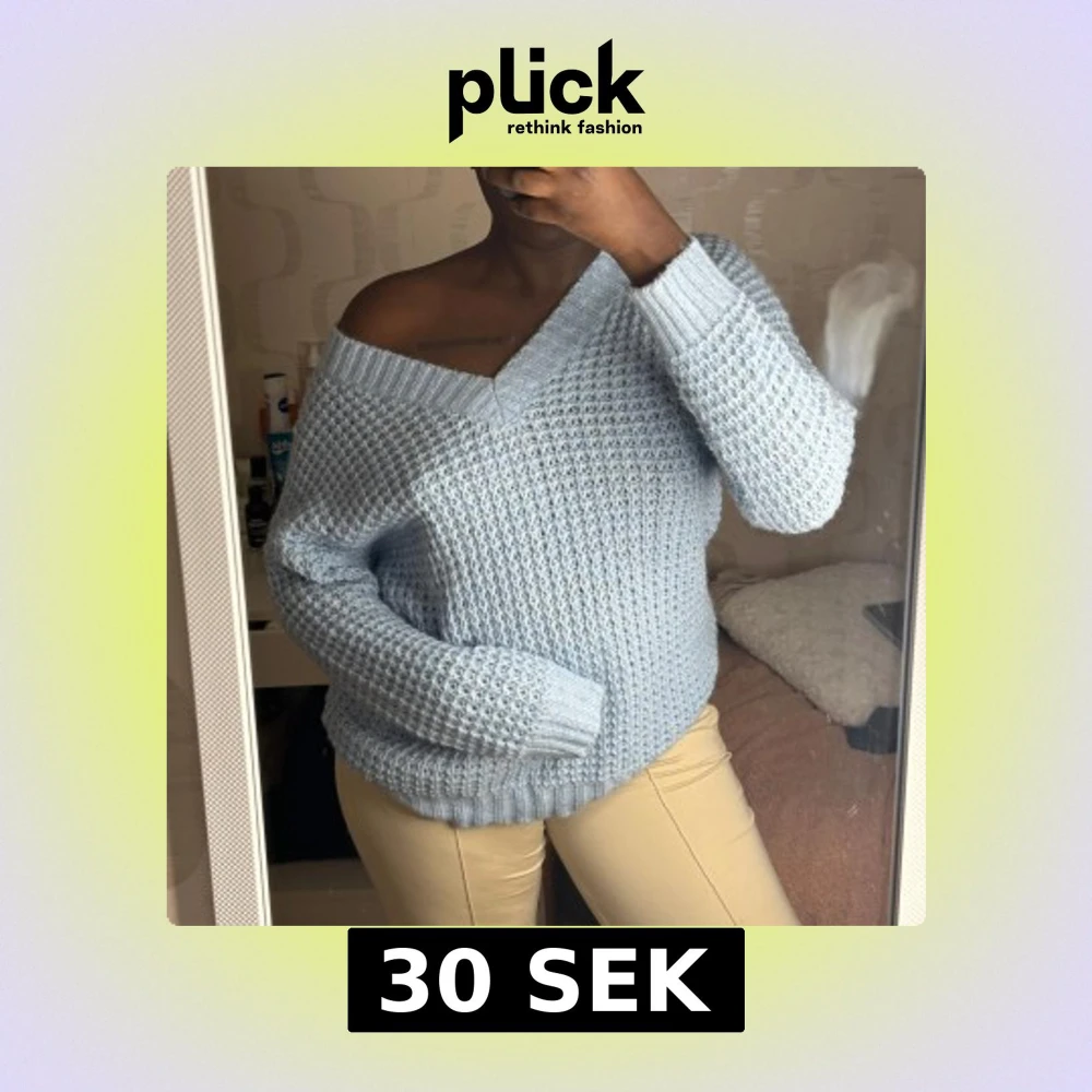 Säljer en mysig ljusblå stickad tröja med v-ringning. Tröjan har en avslappnad passform och långa ärmar. Den kan bäras både som offshoulder och med normal passform 🩵