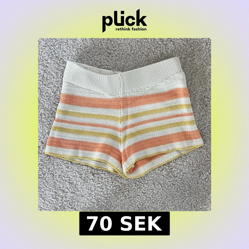 Superfina stickade shorts med bred resår i midjan. Randigt mönster i beige , ljusgul och persikoorange. Perfekta för varma dagar eller som mysplagg hemma. Mjukt och stretchigt material.