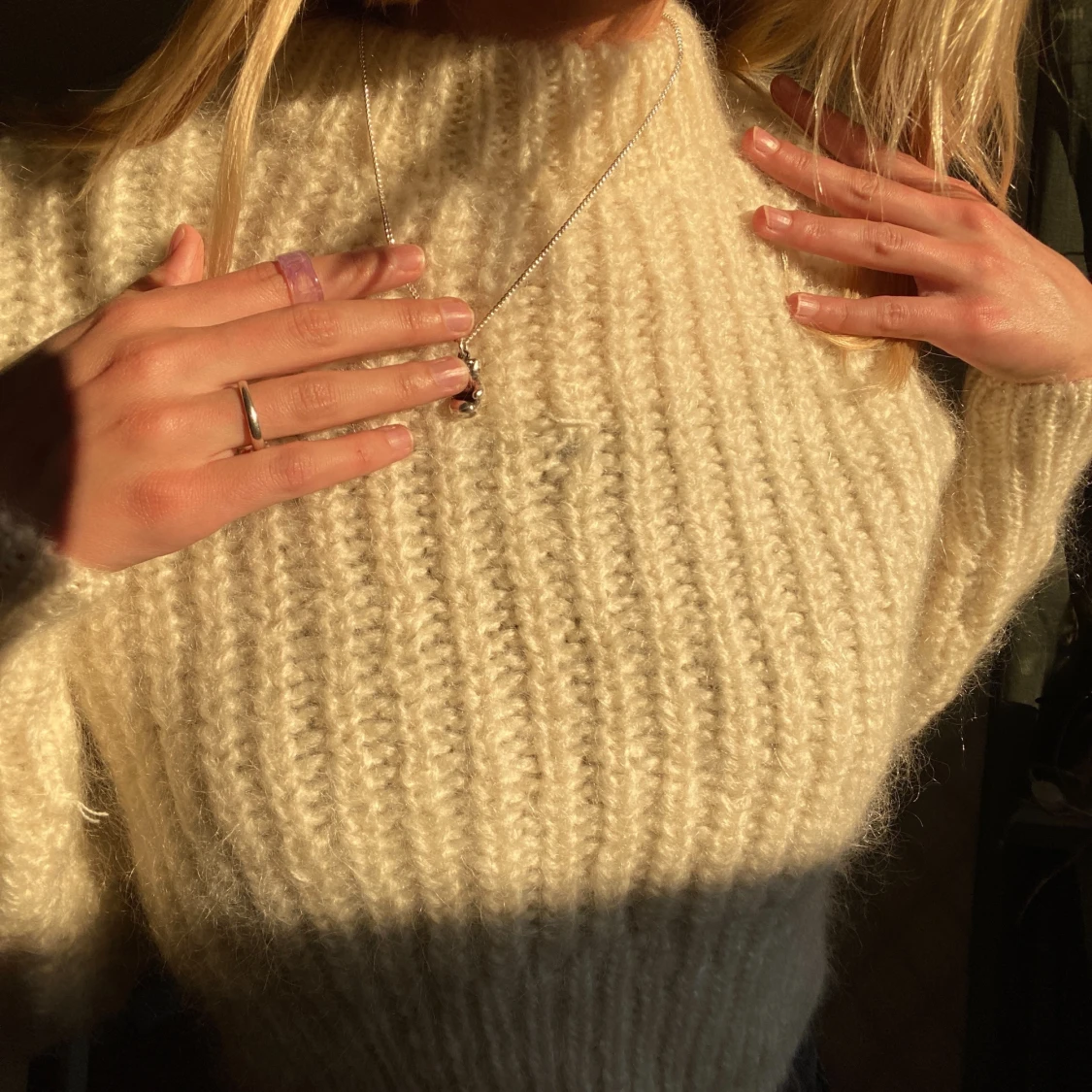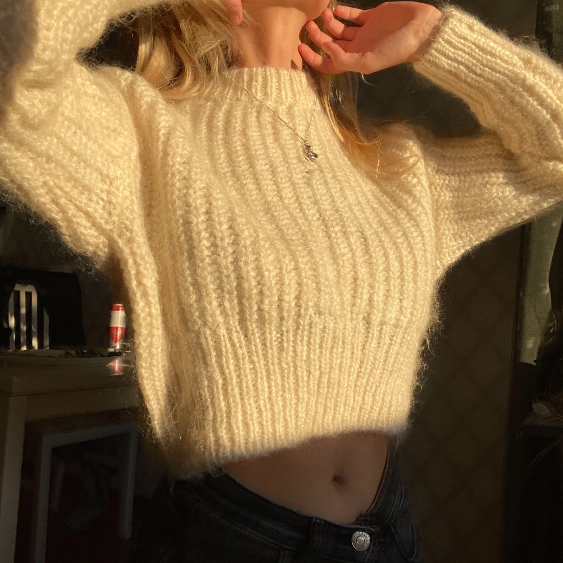 Superfin croppad vit stickad från HM. Litet mindre hål men syns knappt (se bild 2). Mohair/Wool blend. Strl M men funkar super på S med