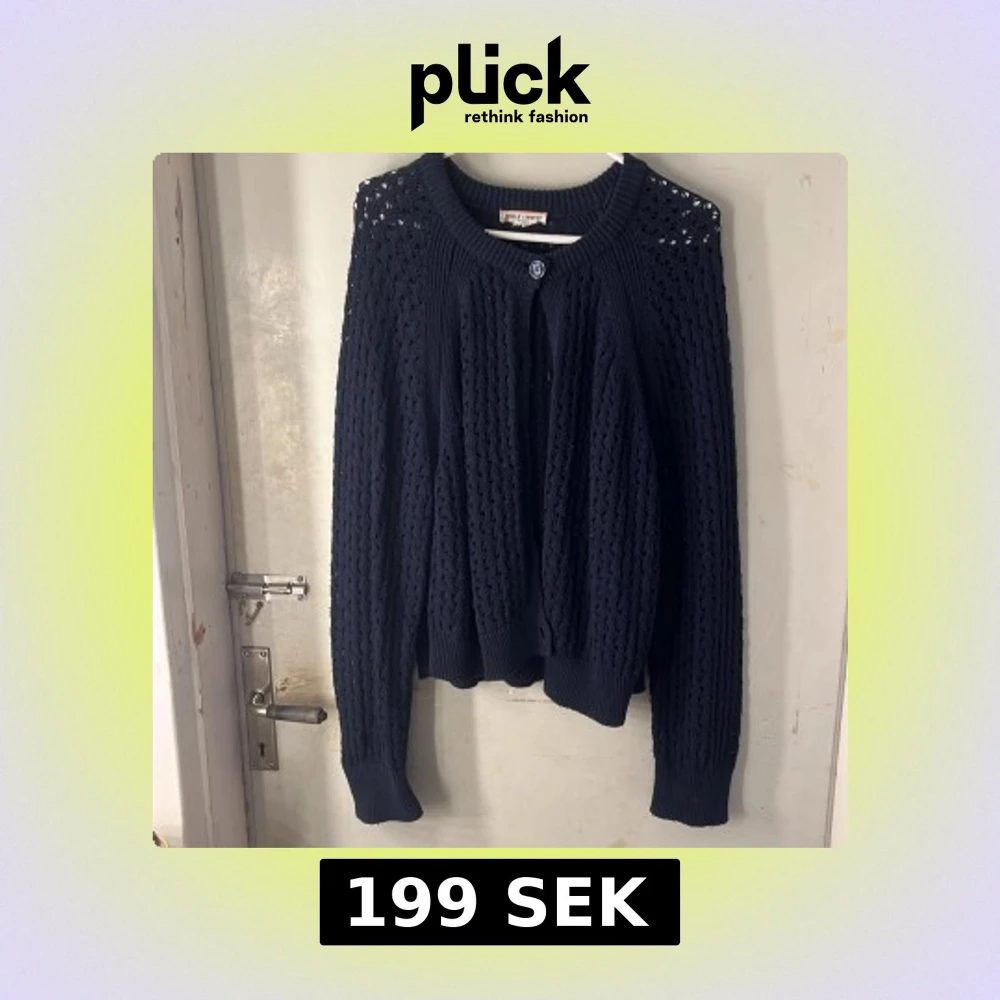 Snygg mörkblå stickad kofta från Holly & Whyte med hålmönster och rund hals. Koftan har knappar framtill och ribbade muddar vid ärmslut och nederkant. Perfekt för lager-på-lager och chill stil. Perfekt nu till höst&vinter