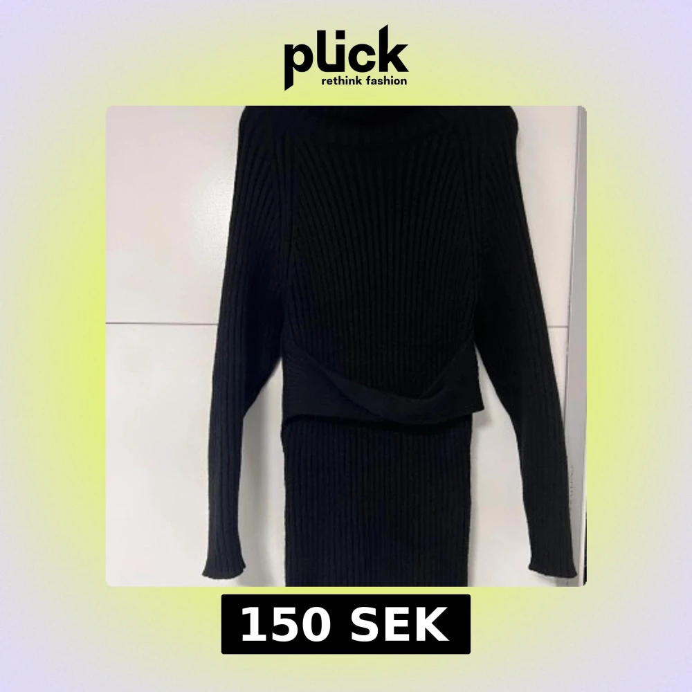 Svart långklänning i ribbstickad design med polokrage och långa ärmar. Klänningen har en snygg omlottdetalj i midjan. Lite knottrig på vissa ställen.