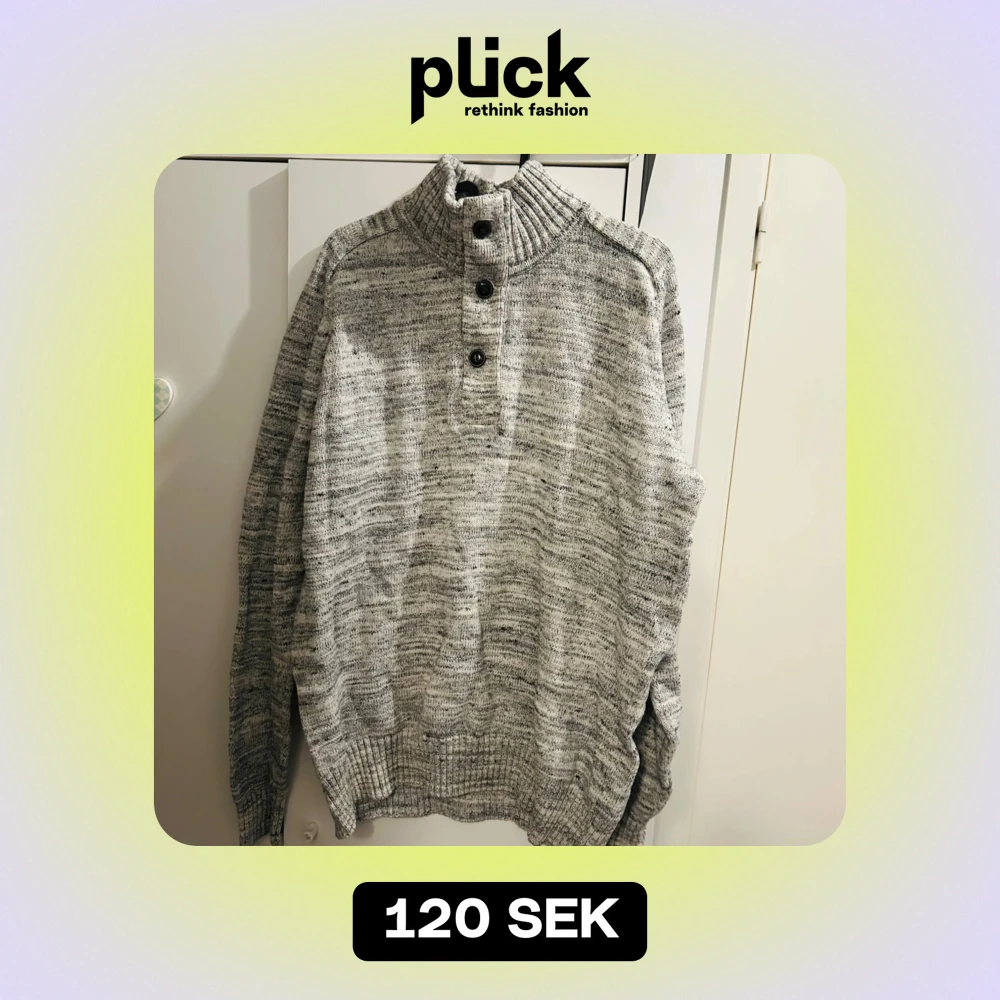 Säljer en mysig grå stickad tröja från H&M L.O.G.G. med hög krage och tre knappar framtill. Perfekt för kyliga dagar med sin mjuka och varma känsla. Tröjan har långa ärmar och en avslappnad passform. Passar både till vardags och lite finare tillfällen. 🧶