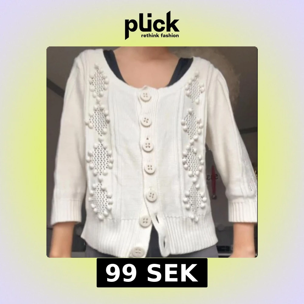 Säljer en söt vit kofta med stora knappar och dekorativa stickade detaljer💕. Koftan har trekvartsärmar och en ribbad nederkant. Perfekt för en stilren och mysig look.🩷skriv vid frågor/intresse💞(storlek xl passar mig med s/m)