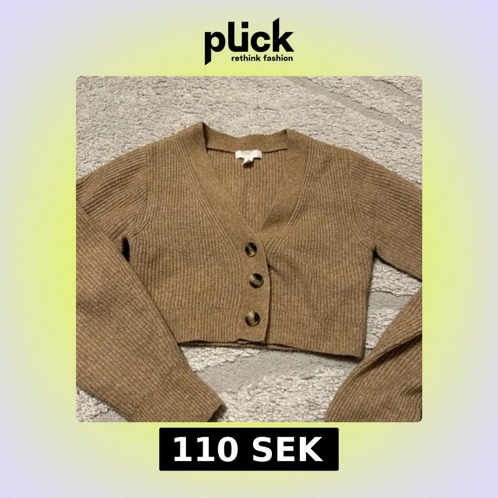 Snygg croppad kofta i beige med ribbad struktur och tre stora knappar framtill. V-ringad och långärmad, perfekt att slänga över en topp eller klänning. Superenkel att styla till både jeans och kjol.