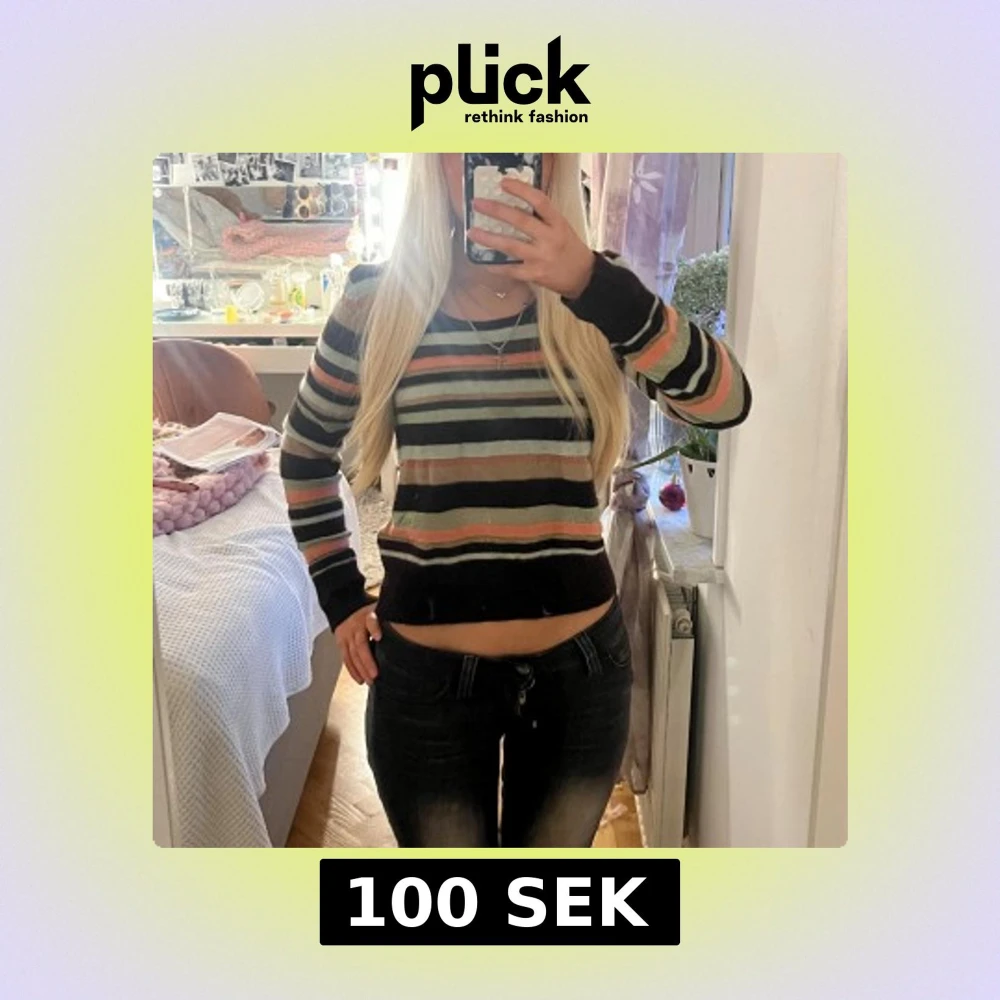 Säljer en snygg stickad tröja med randigt mönster i brunt, rosa, beige och ljusgrått. Tröjan har långärmad passform och är lite croppad i modellen. Perfekt för dig som gillar färg och vill ha en chill look.