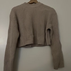 Grå stickad polotröja med ribbade ärmar - Mysig grå stickad polotröja med breda ribbade ärmar och hög krage. Tröjan har en loose fit och är perfekt för kyliga dagar. Snygg att styla med jeans eller leggings för en avslappnad vibe. Bilderna är från tjejen jag köpte tröjan av. Jag har endast använt tröjan en gång.