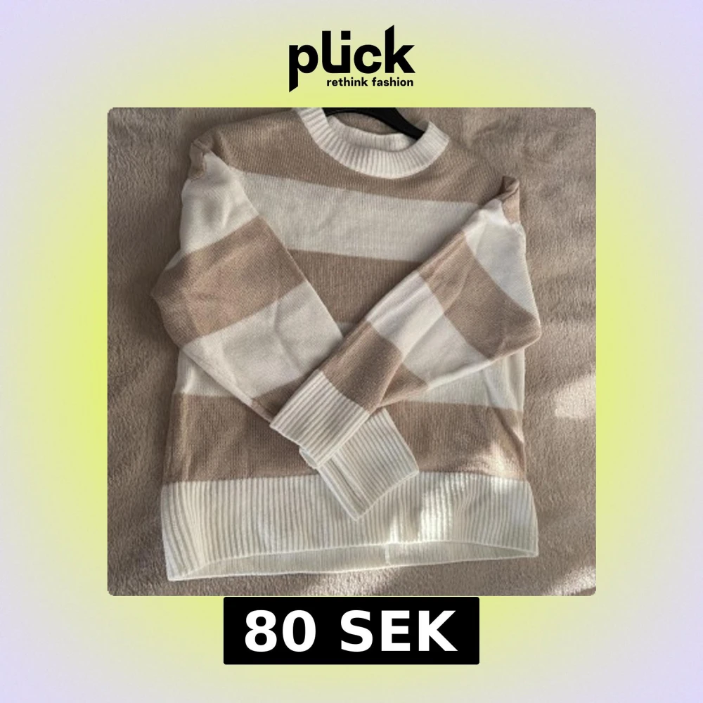 Säljer en snygg randig tröja från H&M Divided i beige och vit. Tröjan har långa ärmar och en rund halsringning. Perfekt för en avslappnad stil. Bild 1:framsida Bild 2:Baksida Bild 3: Framsida Bild 4: Märke och storlek Bild 5:Detalj Skick: Tröjan är använd men i ett bra skick
