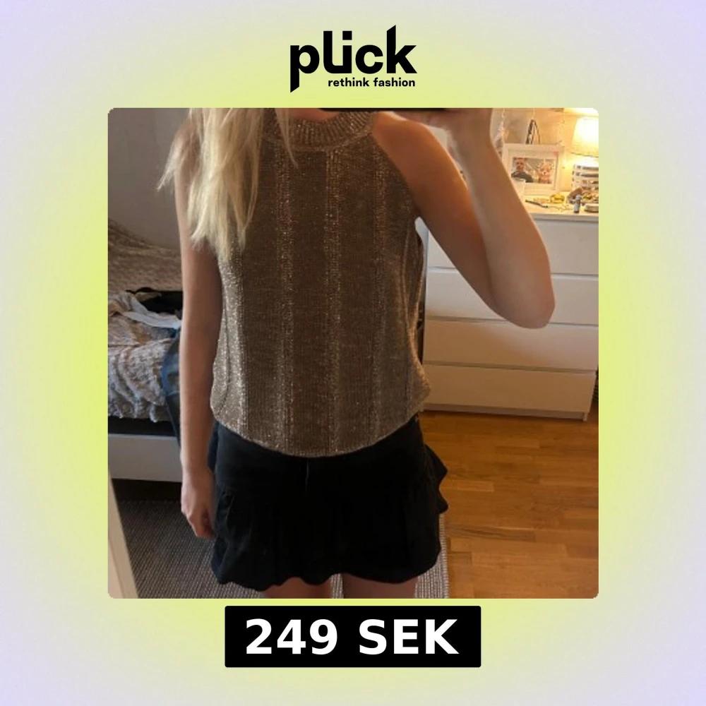 Supersnygg glittrig stickad topp i guld med ribbade detaljer och hög hals. Använd nån gång men i väldigt bra skick!