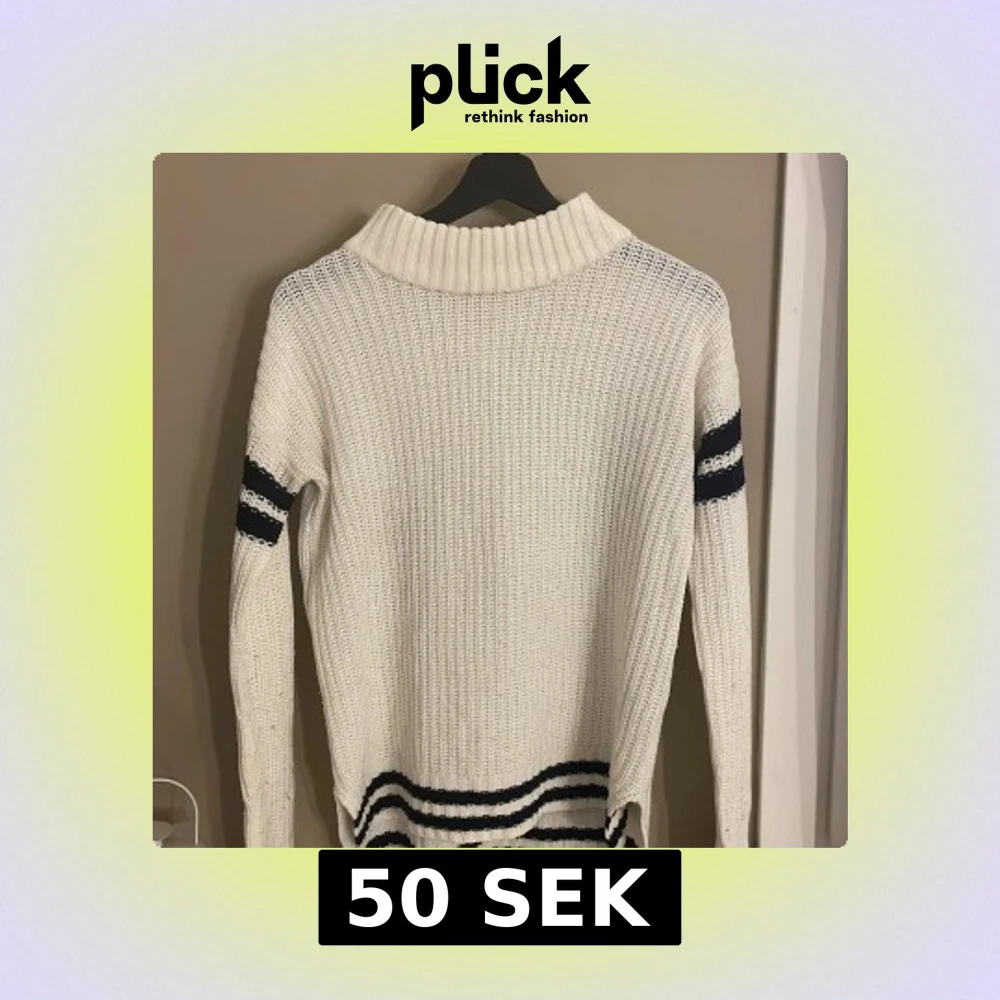 Vit stickad tröja från Iconic Sport i storlek XS. Tröjan har svarta ränder på ärmarna och nertill, samt en hög ribbad krage. Långärmad och med en loose fit, perfekt för kyliga dagar.