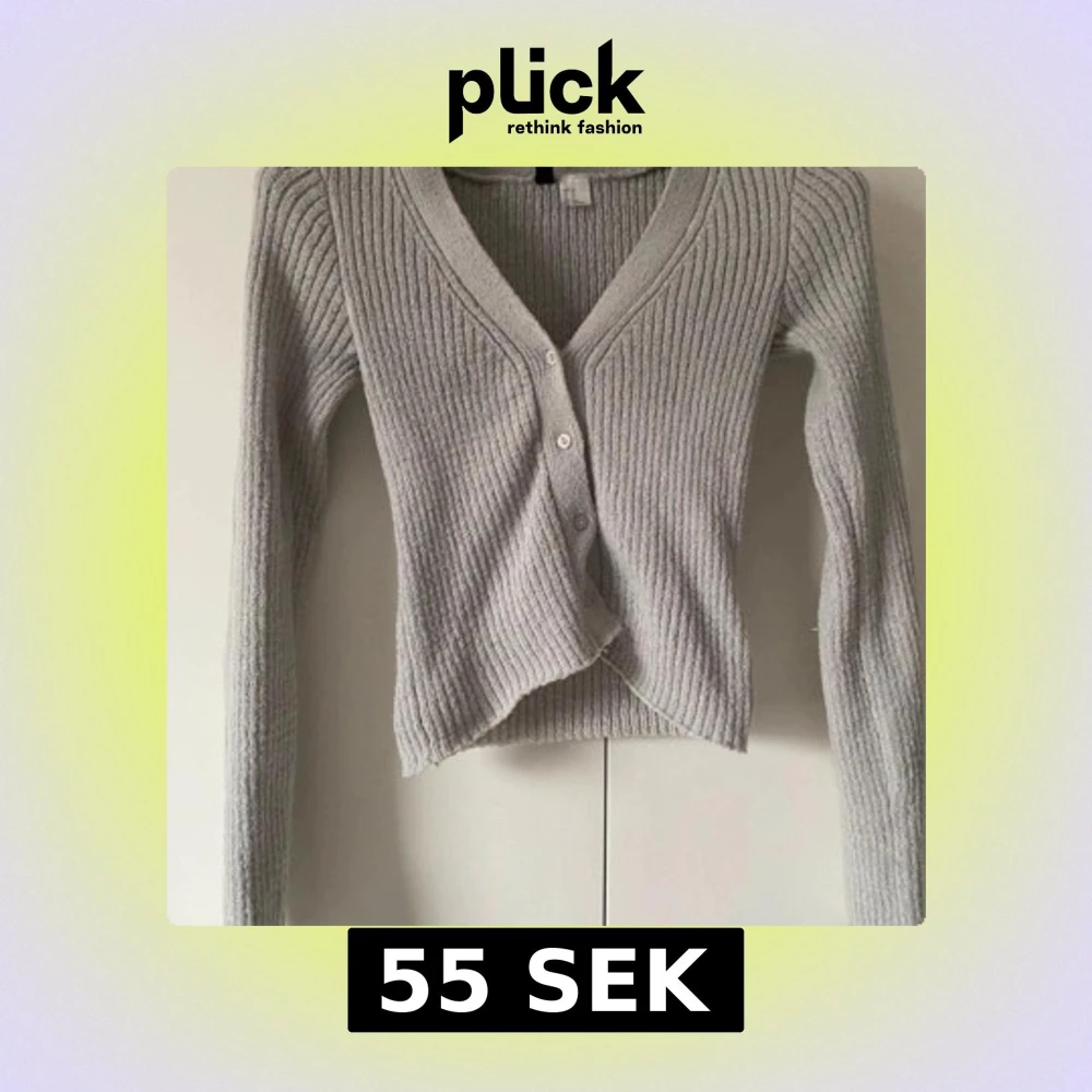 Superfin ljusgrå ribbad kofta från H&M Divided i storlek XS. Koftan har v-ringning, knappar framtill och är långärmad. perfekt att slänga på sig över ett linne eller t-shirt.
