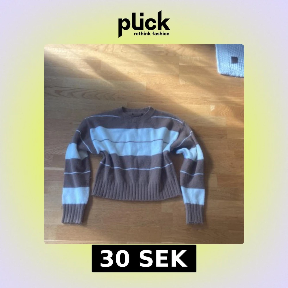 Mysig stickad tröja med breda bruna och vita ränder. Tröjan har ribbad nederkant och ärmar, rund halsringning och lång ärm. Perfekt för chill dagar.