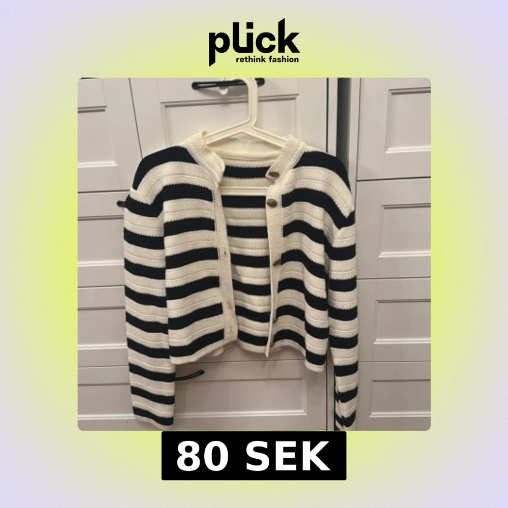 Snygg stickad kofta med svarta och vita ränder. Koftan har långa ärmar och coola guldknappar framtill. Perfekt för dig som gillar klassisk men trendig stil. Oanvänd!!