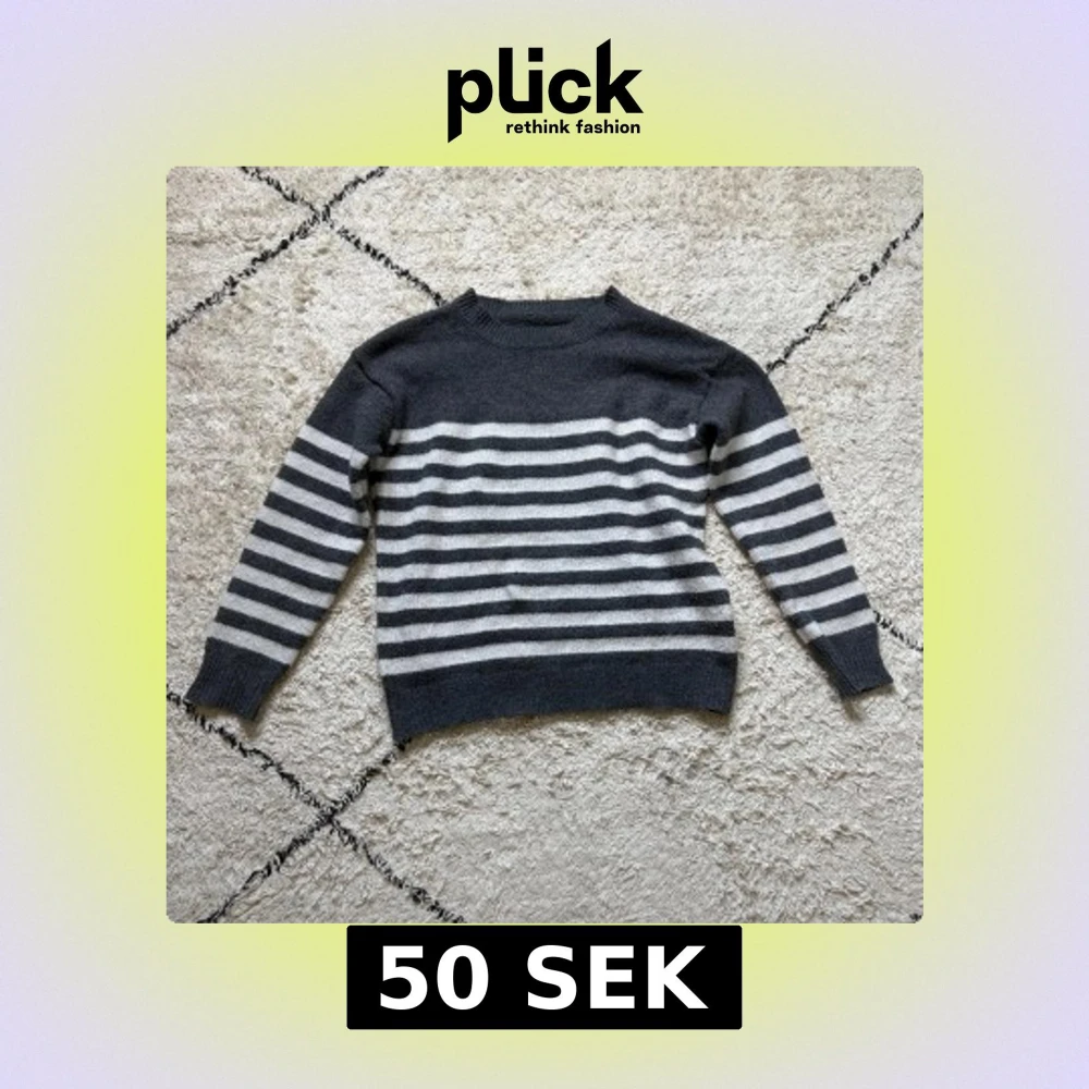 Mysig stickad tröja från SHEIN i mörkgrått och ljusgrått med klassiskt horisontellt randigt mönster. Tröjan har rund halsringning, långa ärmar och ribbade muddar. Perfekt för lager-på-lager under kyliga dagar.