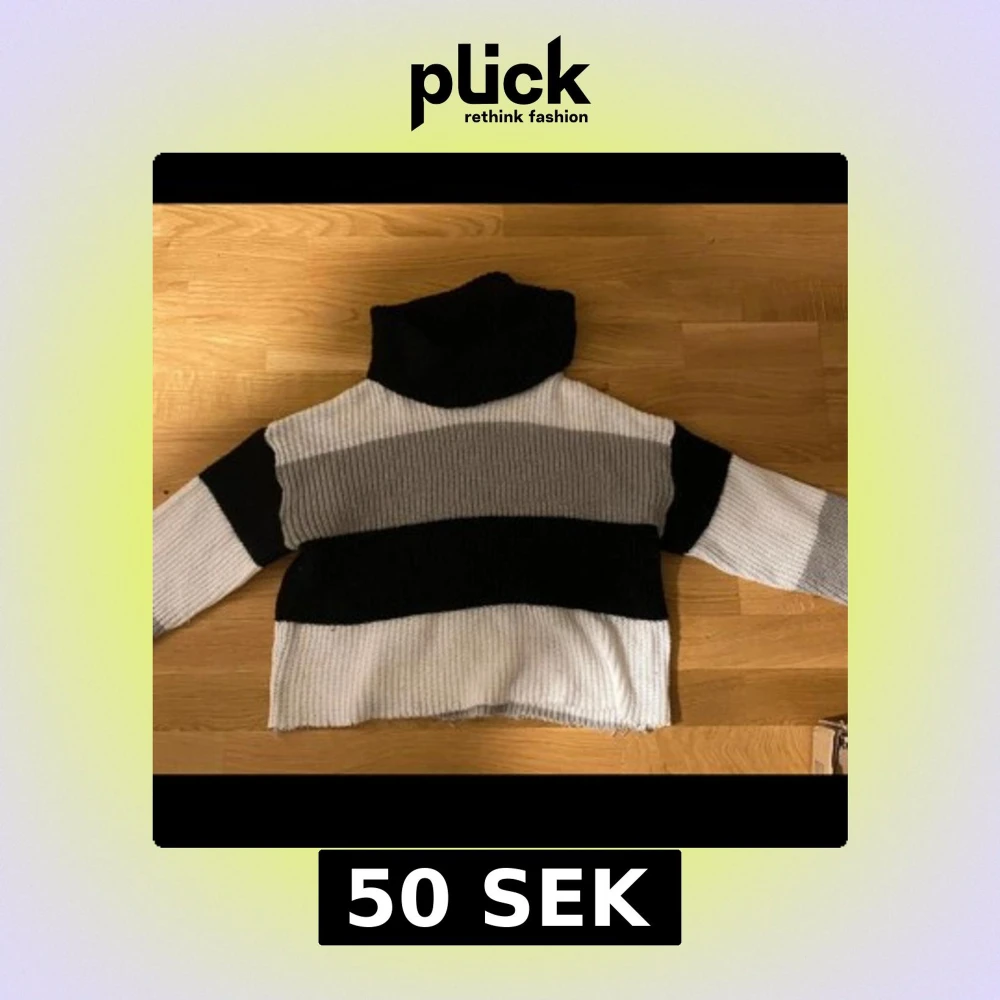 Säljer en mysig stickad polotröja med breda ränder i svart, grått och vitt. Tröjan har en hög polokrage och långa ärmar, perfekt för kyliga dagar. Den ribbade strukturen ger en skön passform.