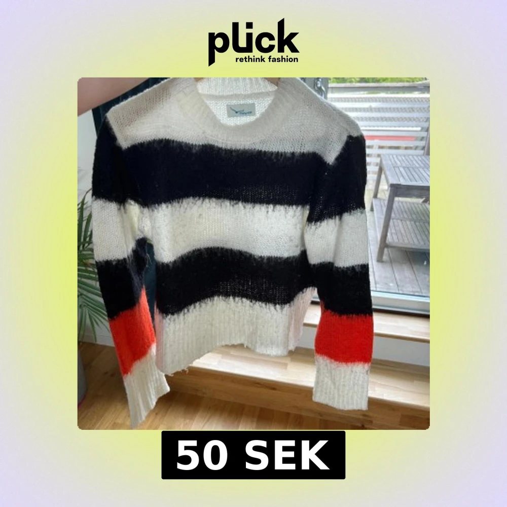 Säljer en stickad tröja med breda ränder i svart, vitt och rött. Tröjan har lång ärm och en croppad passform med rå kant nertill. Perfekt för dig som gillar färg och mönster! Bra skick dock lite nopprig men går nog att ta bort med en noppa maskin! Köpt på Vero Moda, märke är Twintip!