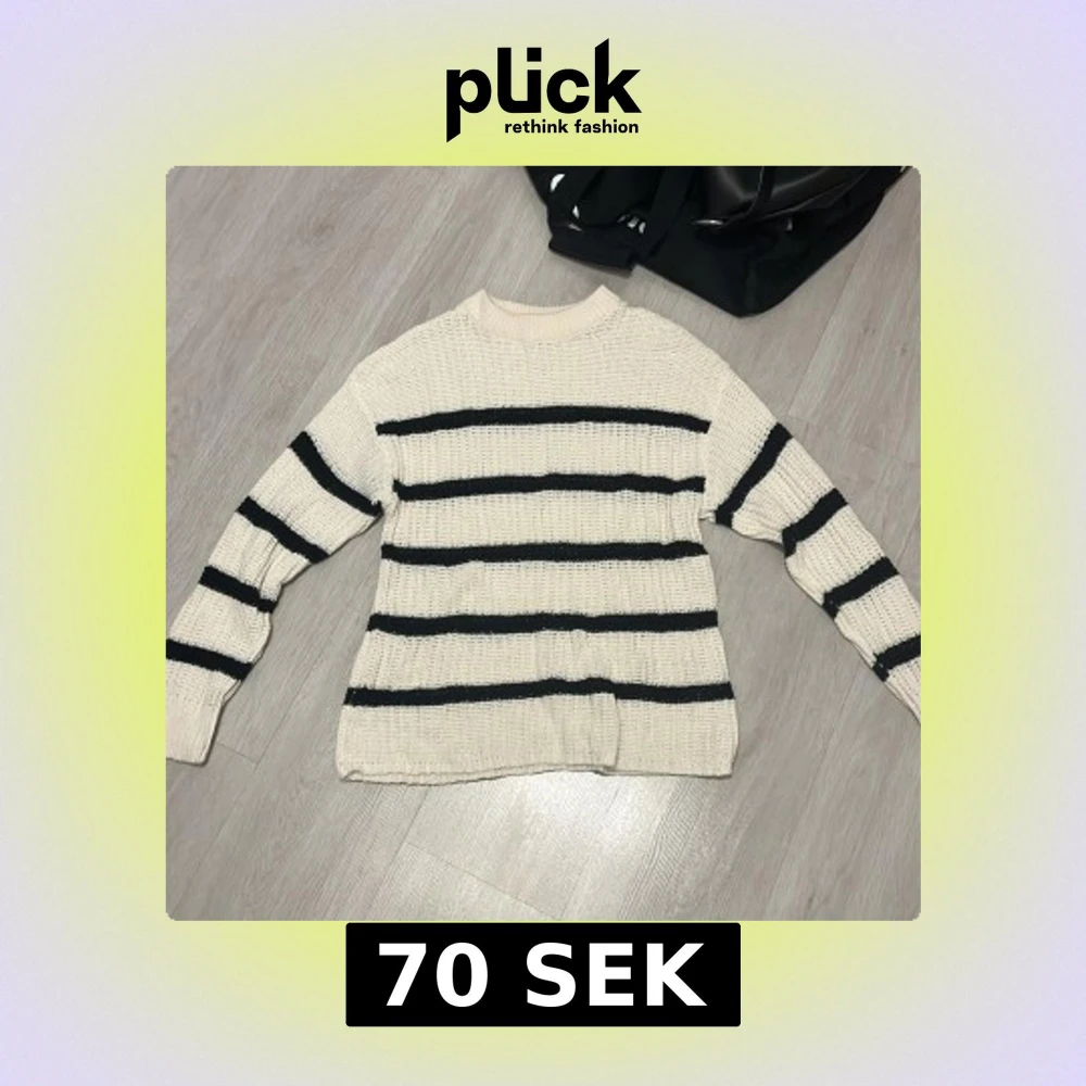 Säljer en mysig stickad tröja i beige med svarta ränder. Tröjan har en klassisk design med långa ärmar och rund hals. Perfekt för kyligare dagar.
