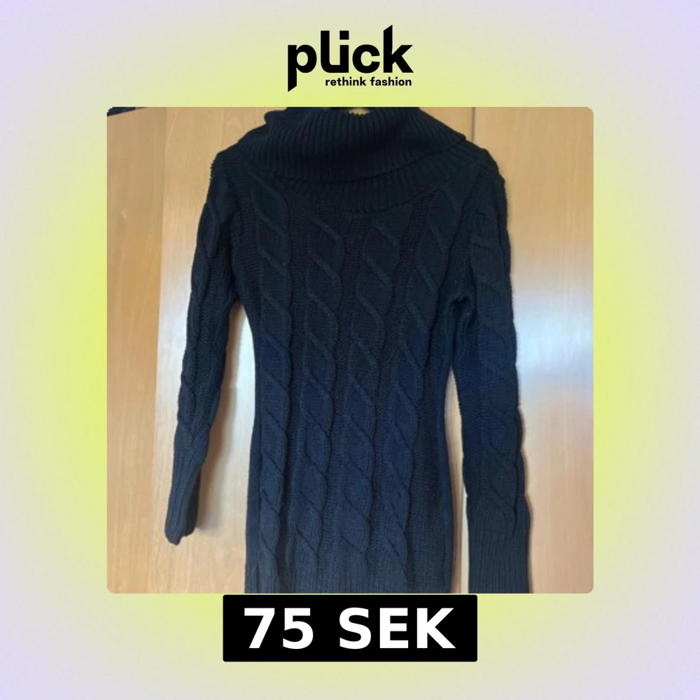 Mysig svart stickad polotröja med grovt kabelstickat mönster. Tröjan har hög polokrage och långa ärmar, perfekt för kyliga dagar. Snygg och enkel att matcha med jeans eller kjol.