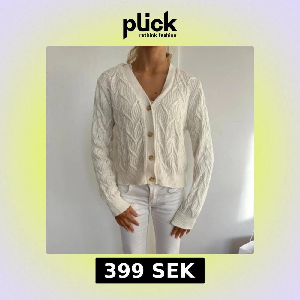 Superfin vit kabelstickad kofta från Soaked med snyggt mönster och träfärgade knappar som passar till alla årstider/tillfällen!! Endast använd fåtal gånger. Koftan har v-ringning, ribbade muddar, nypris 800kr