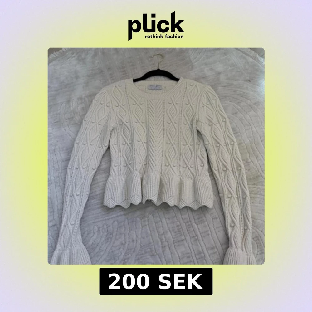 Supersöt vit stickad tröja från Holly & Whyte med snyggt strukturmönster och volangkant nedtill. Tröjan har långärmade ärmar och rund halsringning. Perfekt för dig som gillar detaljer och vill ha en mysig look.