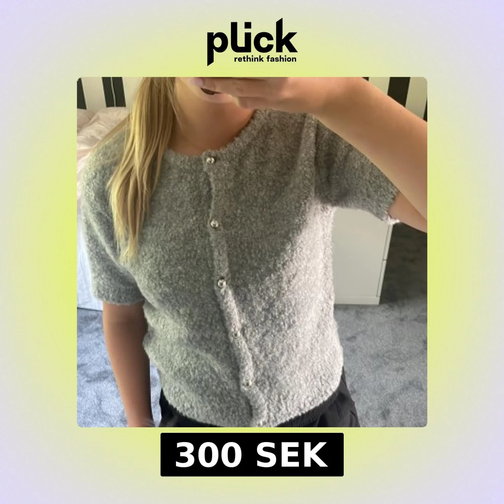 Grå stickad kofta med korta ärmar och silvriga knappar framtill. Helt ny, aldrig använd.