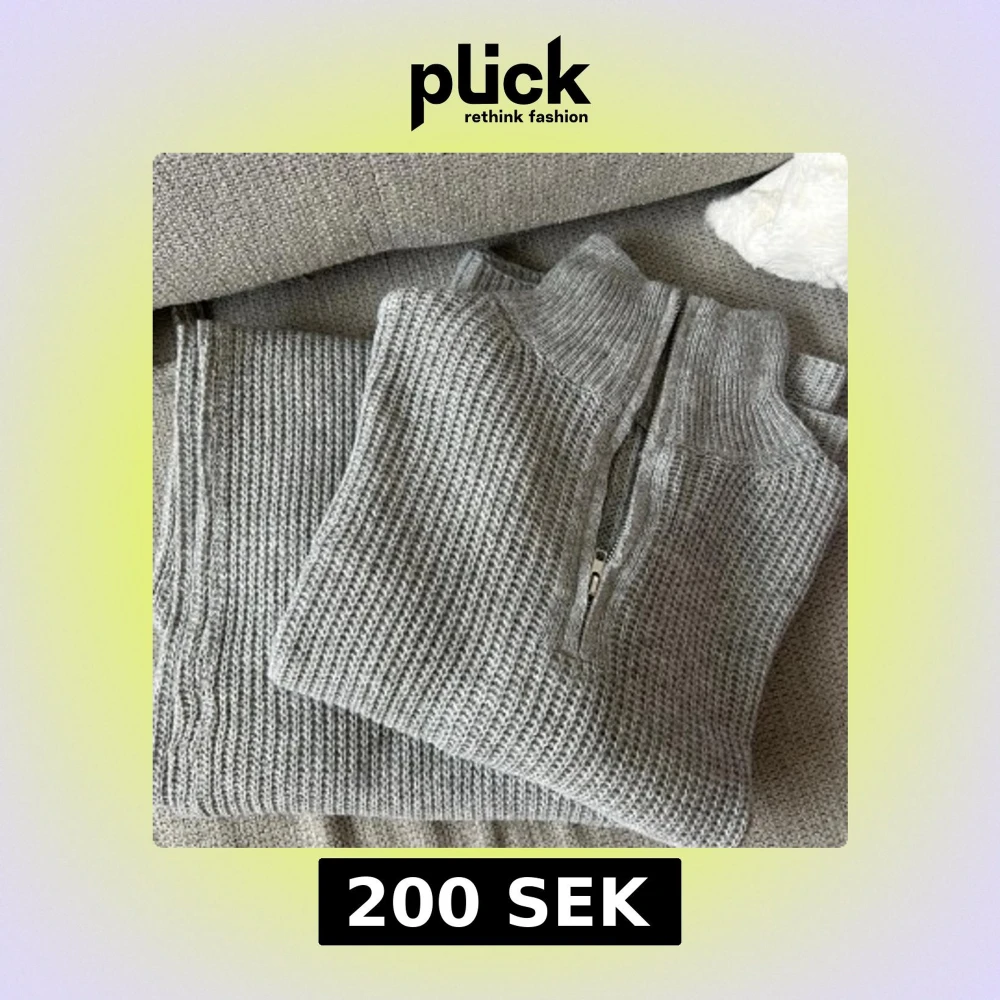 Grått stickat set – tröja och byxor Bekvämt grått stickat set. Tröjan har långa ärmar och dragkedja vid halsen. Byxorna har vida ben. Jag säljer det eftersom byxorna är lite för korta för mig, passar bättre till tjejer som är kortare (~164 cm).