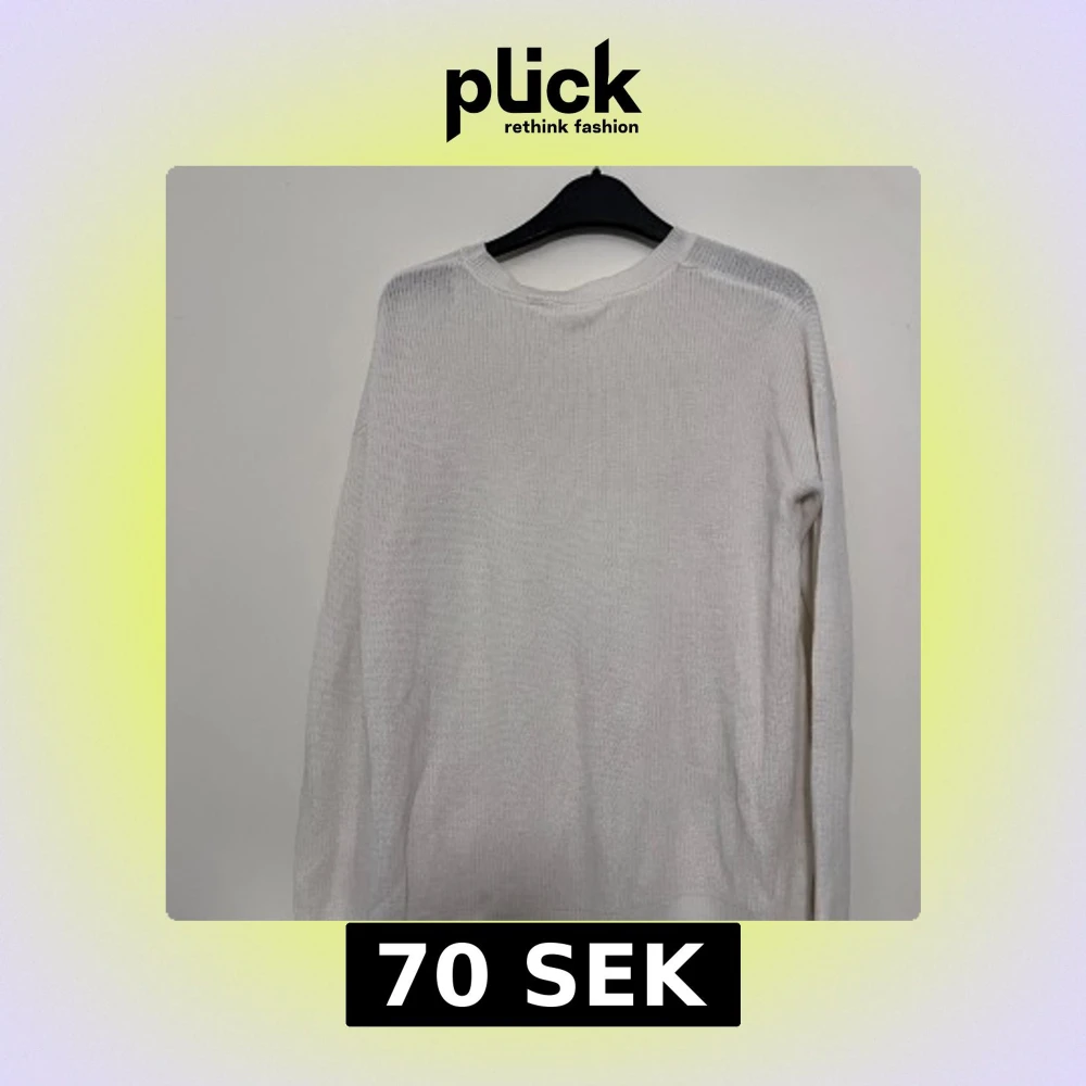 Säljer en stilren vit stickad tröja med rund halsringning. Tröjan har långa ärmar och en mjuk textur, perfekt för kyligare dagar. Passar bra till både jeans och kjol.