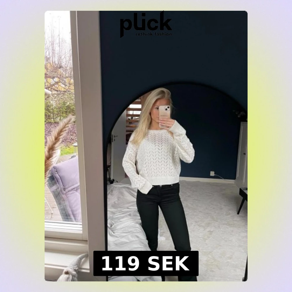 Säljer en vit stickad tröja med snyggt hålmönster och ribbade muddar. Supermjuk och passar till både höst och vinter.
