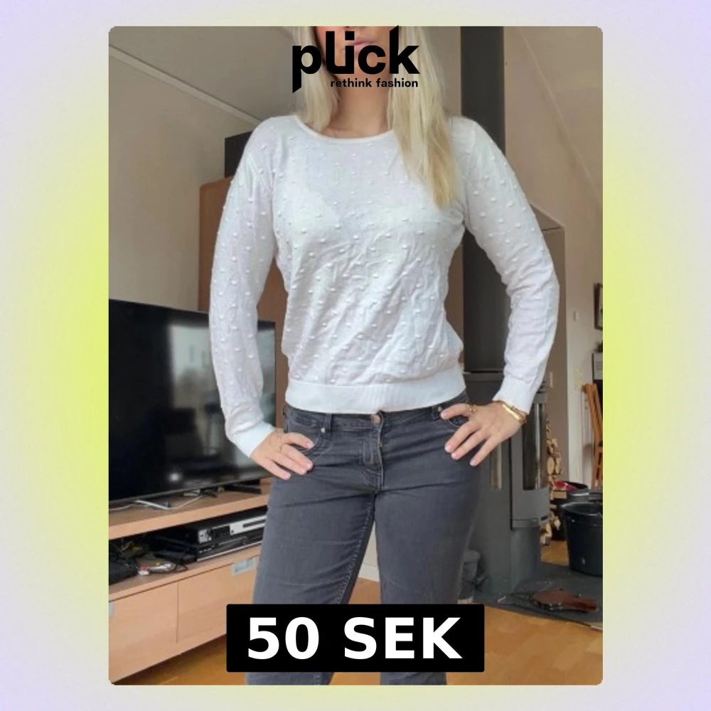 Snygg vit stickad tröja med diskret prickigt mönster. Rund halsringning och långa ärmar, ribbade muddar vid ärmslut och nederkant. Står tyvärr ingen storlek men skulle säga XS då jag vanligvis har S
